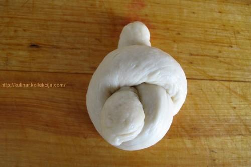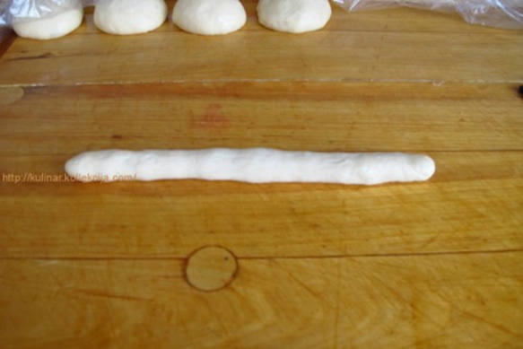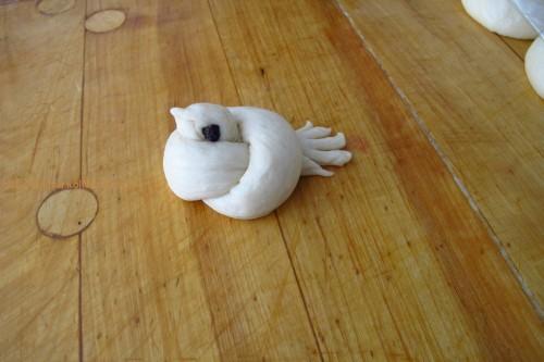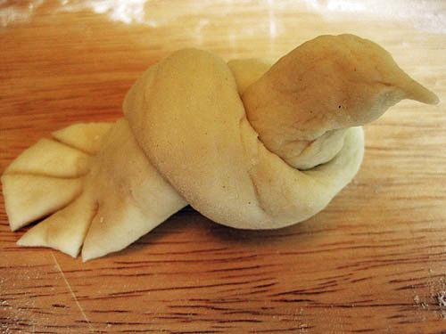 План: 1.Берем колобок теста и раскатываем в жгут. 2.Жгут завязываем в узел. 3.Один конец расплющиваем и режем. Другой конец немного вытягиваем, формируем голову и клювик. 4.Теперь делаем глазки.