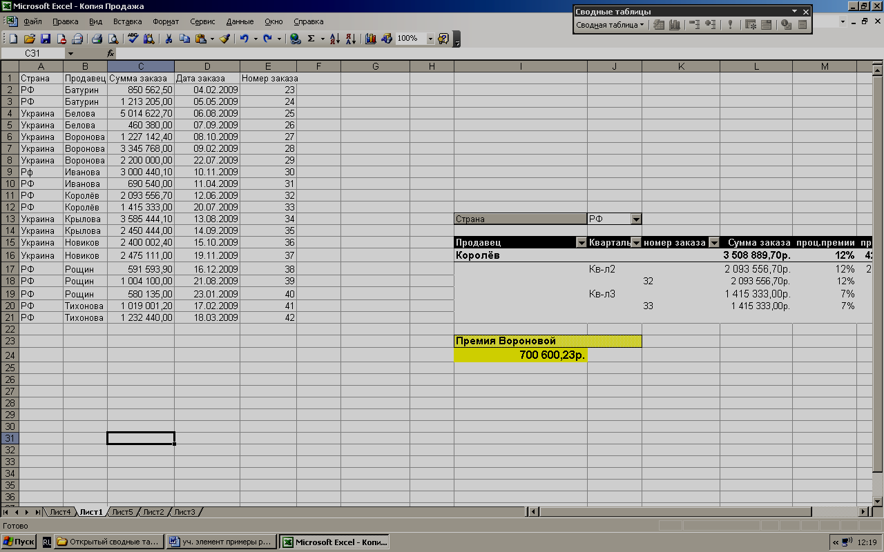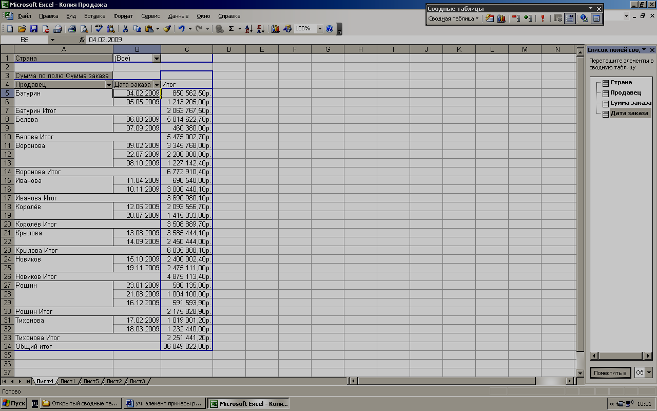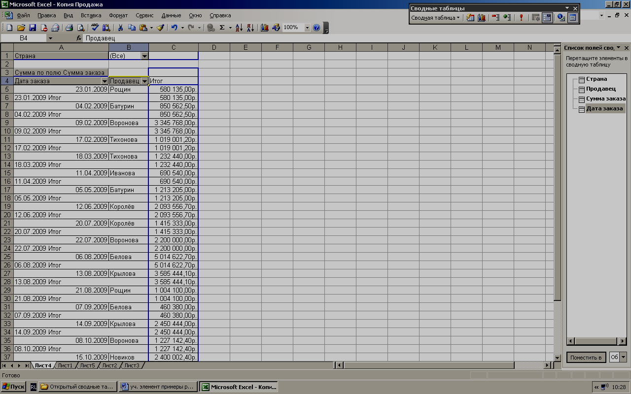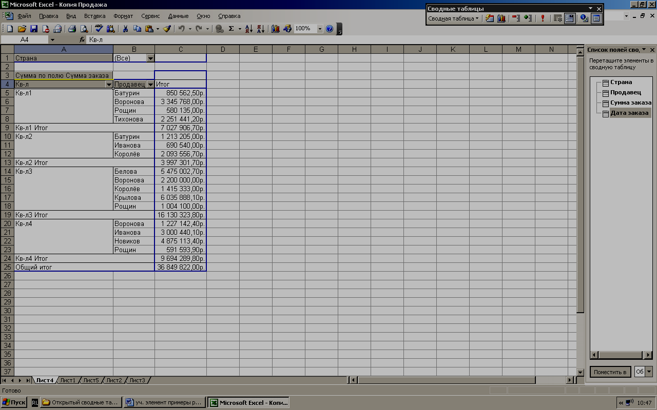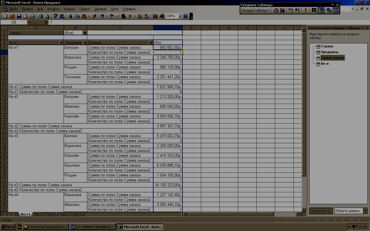 | Создание сводного отчёта При создании сводного отчёта необходимо выполнить следующие требования к исходным данным в электронной таблице: Первой строкой в каждом столбце должен быть заголовок. В пределах диапазона данных, используемых в отчёте, не должно быть пустых столбцов или строк. В каждом столбце должен быть только один тип данных. Если в исходных данных содержатся промежуточные и общие итоги, перед созданием отчёта удалите их. Пример создания сводного отчёта Сначала необходимо заполнить исходные данные. Исходными данными в этом примере служит список продаж по отдельным продавцам. Заголовки столбцов: «Страна», «Продавец», «Сумма заказа», «Дата заказа». Поля строк отображают данные по вертикали, по одной единице на строку. Поля столбцов отображают данные по горизонтали, по одной единице на столбец. Поля страниц отображают данные в виде страниц со сгруппированными или разделенными данными, введенными на них. Элементы данных, в которых отображаются и суммируются числовые данные. Перетащим поля «Страна», «Продавец», «Сумма заказа» получим таблицу. Изменение порядка сортировки Форматирование данных щёлкнем любую ячейку в области данных нажмём Параметры поля на панели инструментов Сводные таблицы щёлкнем Формат и выберем денежный формат Добавление другого поля в области списка полей выберем поле «Дата заказа» щёлкнем на кнопке Добавить в область строк перетащим поле «Дата заказа» левее поля «Продавец» Теперь оба поля Дата заказа и Продавец имеют в отчёте построчную ориентацию. Но результаты продаж отсортированы по дням с итогом за день. Создание квартальной группы переименуем поле Дата заказа в Квартал: для этого щёлкнем дважды поле Дата заказа в появившемся окне введём новое имя Кв-л правой кнопкой мыши щёлкнем поле с новым названием Кв-л, выберем Группа и структура щёлкнем Группировать в появившемся окне выберём Кварталы Результатом будет новое отображение — сравнение поквартальных результатов продаж для каждого продавца. Найдём количество продаж, которое было сделано каждым продавцом Перетащим поле Сумма заказа в область данных ещё раз и ему автоматически будет присвоено имя Сумма по полю Сумма заказа 2. В результате появится новый заголовок поля Данные. Изменим способ вычисления с функции «Сумма» на функцию «Количество», для этого: щёлкнем в одной из ячеек с именем Сумма по полю Сумма заказа 2 щёлкнем кнопку Параметры поля на панели инструментов Сводные таблицы выберем функцию Количество в списке Операция щёлкнем ОК. Форматирование отчета сводной таблицы Отформатируем отчет таким образом, что его будет проще читать. Для этого: поместим в область строк поле «Номер заказа» переименуем ячейку «Сумма по полю Сумма заказа» в «Заказ руб.» щёлкнем кнопку Формат отчета на панели инструментов Сводные таблицы выберём один из форматов сводной таблицы в диалоговом окне Автоформат. ОК. Отображение числовых данных в виде процента от общего количества продаж Чтобы изменить функцию Количество на Долю от общей суммы, нужно щёлкнуть в одной из ячеек поля Количество. После этого: щёлкнем кнопку Параметры поля на панели инструментов Сводные таблицы в списке Операция изменим функцию суммирования Количество на Сумма щёлкнем Дополнительно и в раскрывающемся списке Дополнительные вычисления выберем Доля от общей су
