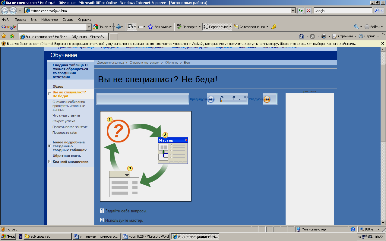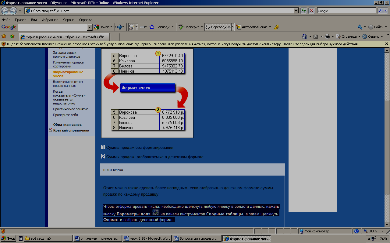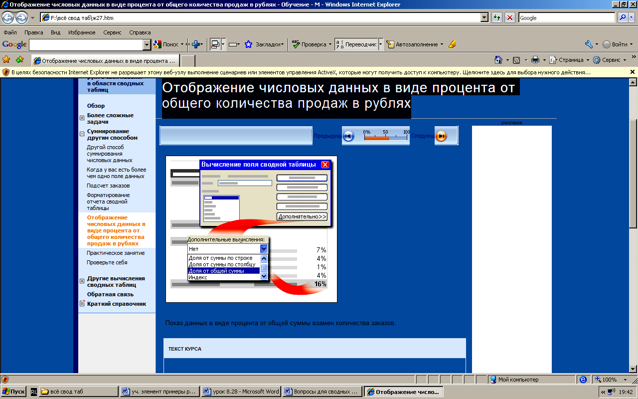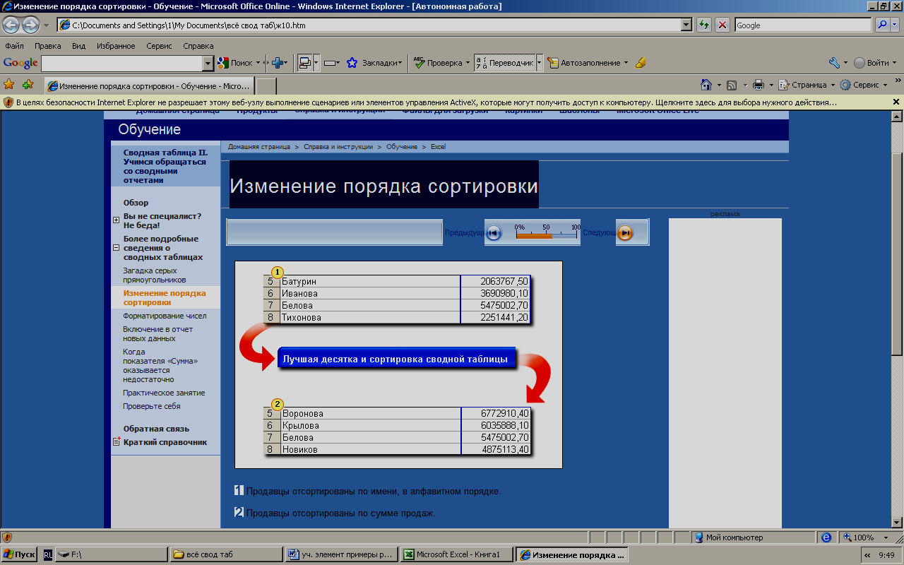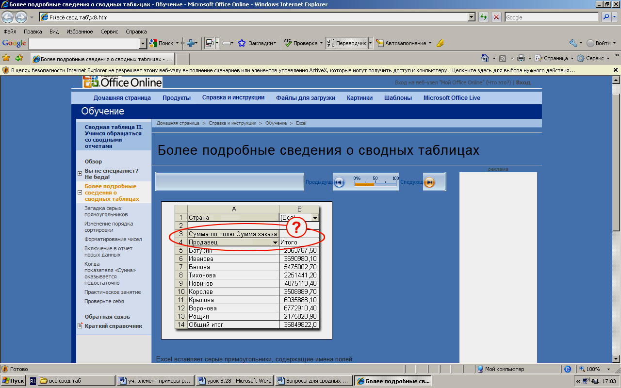 | Создание сводного отчёта При создании сводного отчёта необходимо выполнить следующие требования к исходным данным в электронной таблице: Первой строкой в каждом столбце должен быть заголовок. В пределах диапазона данных, используемых в отчёте, не должно быть пустых столбцов или строк. В каждом столбце должен быть только один тип данных. Если в исходных данных содержатся промежуточные и общие итоги, перед созданием отчёта удалите их. Пример создания сводного отчёта Сначала необходимо заполнить исходные данные. Исходными данными в этом примере служит список продаж по отдельным продавцам. Заголовки столбцов: «Страна», «Продавец», «Сумма заказа», «Дата заказа». Поля строк отображают данные по вертикали, по одной единице на строку. Поля столбцов отображают данные по горизонтали, по одной единице на столбец. Поля страниц отображают данные в виде страниц со сгруппированными или разделенными данными, введенными на них. Элементы данных, в которых отображаются и суммируются числовые данные. Перетащим поля «Страна», «Продавец», «Сумма заказа» получим таблицу. Изменение порядка сортировки Форматирование данных щёлкнем любую ячейку в области данных нажмём Параметры поля на панели инструментов Сводные таблицы щёлкнем Формат и выберем денежный формат Добавление другого поля в области списка полей выберем поле «Дата заказа» щёлкнем на кнопке Добавить в область строк перетащим поле «Дата заказа» левее поля «Продавец» Теперь оба поля Дата заказа и Продавец имеют в отчёте построчную ориентацию. Но результаты продаж отсортированы по дням с итогом за день. Создание квартальной группы переименуем поле Дата заказа в Квартал: для этого щёлкнем дважды поле Дата заказа в появившемся окне введём новое имя Кв-л правой кнопкой мыши щёлкнем поле с новым названием Кв-л, выберем Группа и структура щёлкнем Группировать в появившемся окне выберём Кварталы Результатом будет новое отображение — сравнение поквартальных результатов продаж для каждого продавца. Найдём количество продаж, которое было сделано каждым продавцом Перетащим поле Сумма заказа в область данных ещё раз и ему автоматически будет присвоено имя Сумма по полю Сумма заказа 2. В результате появится новый заголовок поля Данные. Изменим способ вычисления с функции «Сумма» на функцию «Количество», для этого: щёлкнем в одной из ячеек с именем Сумма по полю Сумма заказа 2 щёлкнем кнопку Параметры поля на панели инструментов Сводные таблицы выберем функцию Количество в списке Операция щёлкнем ОК. Форматирование отчета сводной таблицы Отформатируем отчет таким образом, что его будет проще читать. Для этого: поместим в область строк поле «Номер заказа» переименуем ячейку «Сумма по полю Сумма заказа» в «Заказ руб.» щёлкнем кнопку Формат отчета на панели инструментов Сводные таблицы выберём один из форматов сводной таблицы в диалоговом окне Автоформат. ОК. Отображение числовых данных в виде процента от общего количества продаж Чтобы изменить функцию Количество на Долю от общей суммы, нужно щёлкнуть в одной из ячеек поля Количество. После этого: щёлкнем кнопку Параметры поля на панели инструментов Сводные таблицы в списке Операция изменим функцию суммирования Количество на Сумма щёлкнем Дополнительно и в раскрывающемся списке Дополнительные вычисления выберем Доля от общей су