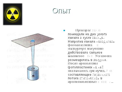 - Итак (Слайд № 8, 9, 10,11), в 1899 г Эрнест Резерфорд обнаружил неоднородность излучения. Исследуя излучение радия в магнитном поле, он обнаружил, что поток радиоактивного излучения имеет сложную структуру: состоит из трех самостоятельных потоков, названных α -, β - и γ - лучами. При дальнейших исследованиях оказалось, что α -лучи представляют из себя потоки ядер атомов гелия, β -лучи – потоки быстрых электронов, а γ-лучи есть электромагнитные волны с малой длиной волны.