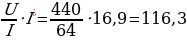 ЭДС якоря: E =U − I ⋅ (RЯ + RВ ) = 220 − (0,443 + 0,197) ⋅ 48,38 =189,04 В.