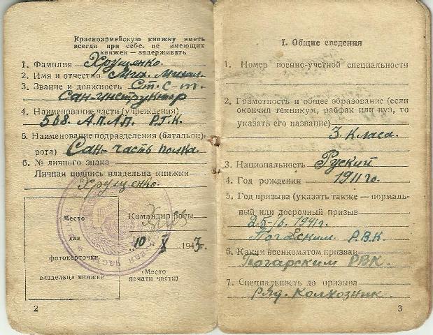 - Родилась я в трудное послевоенное время в 1948 году. Моего отца звали Хрущенко Михаил Михайлович. Он родился в 1911 году, жил в селе Мирские, работал в колхозе трактористом. 25 июня 1941 года был призван Погарским РВК на фронт.