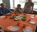 Во время практической работы 2 ученицы из каждой команды готовят бутерброды, а 2 другие девочки заняты сервировкой стола.