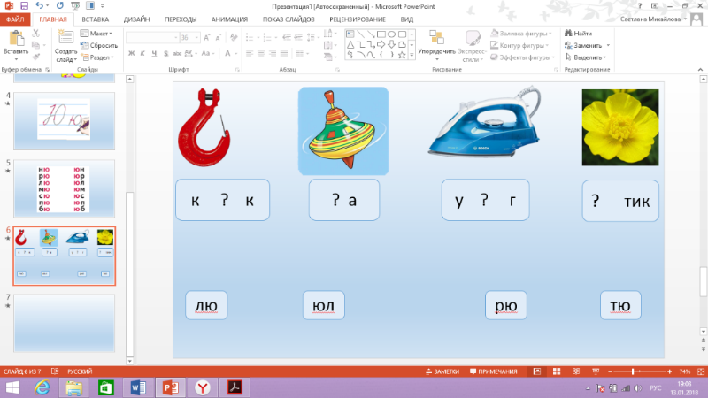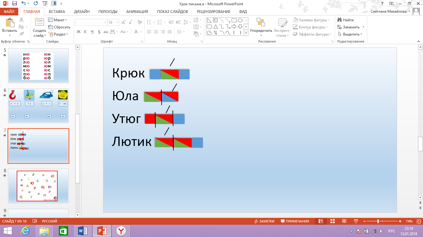| - Рассмотрите внимательно образец строчной и прописной буквы. Кто может назвать, из каких элементов состоит буква? (Слайд 4) - Строчная буква ю состоит из трех элементов. (/-наклонная линия, -«качалочка», о- овал) - Трудные ли они? Перед написание буквы, учитель напоминает правила посадки во время письма. Ну что? Готовы к работе? Тогда... Сели прямо, ноги вместе, Под наклон возьмём тетрадь. Левая рука на месте, Правая рука на месте, Можно начинать писать!!! -Сможете ли вы написать их красиво? Учитель обращает внимание на то, что в прописях есть помощники: точки-ориентиры. Они показывают, где буква меняет своё направление. Можно приучить детей писать под счёт. Образец написания буквы на доске. Прописывание элементов буквы в Прописи стр. 82. -Выберите самую красивую букву. - Поднимите руку, у кого получилась буква такая же, как в показе. -Сравним прописной вариант с печатным: чем похоже написание, а чем отличается? - Посмотрите на следующее задание. Кто догадался, что нужно сделать? -Правильно ребята, нужно обвести печатный вариант, а затем перевести в письменный. - Прочитайте первый слог. (Юл) - На каком месте стоит буква Ю? (на первом) - С какой буквой соединили букву ю? - Какое соединение? (нижнее) (Буква ю взяла за руку букву Л) -Ребята, а какое слово может начинаться (юл) (Юла, юлить) Запись - Прочитайте следующий слог. Чем он интересен? (слог- слово) - А что такое юг? (Часть света, где тепло, туда улетают птицы, растут фрукты, экзотические растения) -Ребята, а сколько звуков будет обозначать буква ю в данных слогах? (Почему?) - Кто испытывает затруднение? - А теперь запишем слоги под диктовку в тетрадь. Запись под диктовку: лю, юн, юр, рю, юм - Вспомните слова, где встретились бы данные слоги (люстра, плюшка, лютый юнга, юркий, брюки, брюква, юмор) | П7. Ученики анализируют образец изучаемой буквы, выделяют элементы в строчной букве и прописной. Сравнивают буквы с печатной.