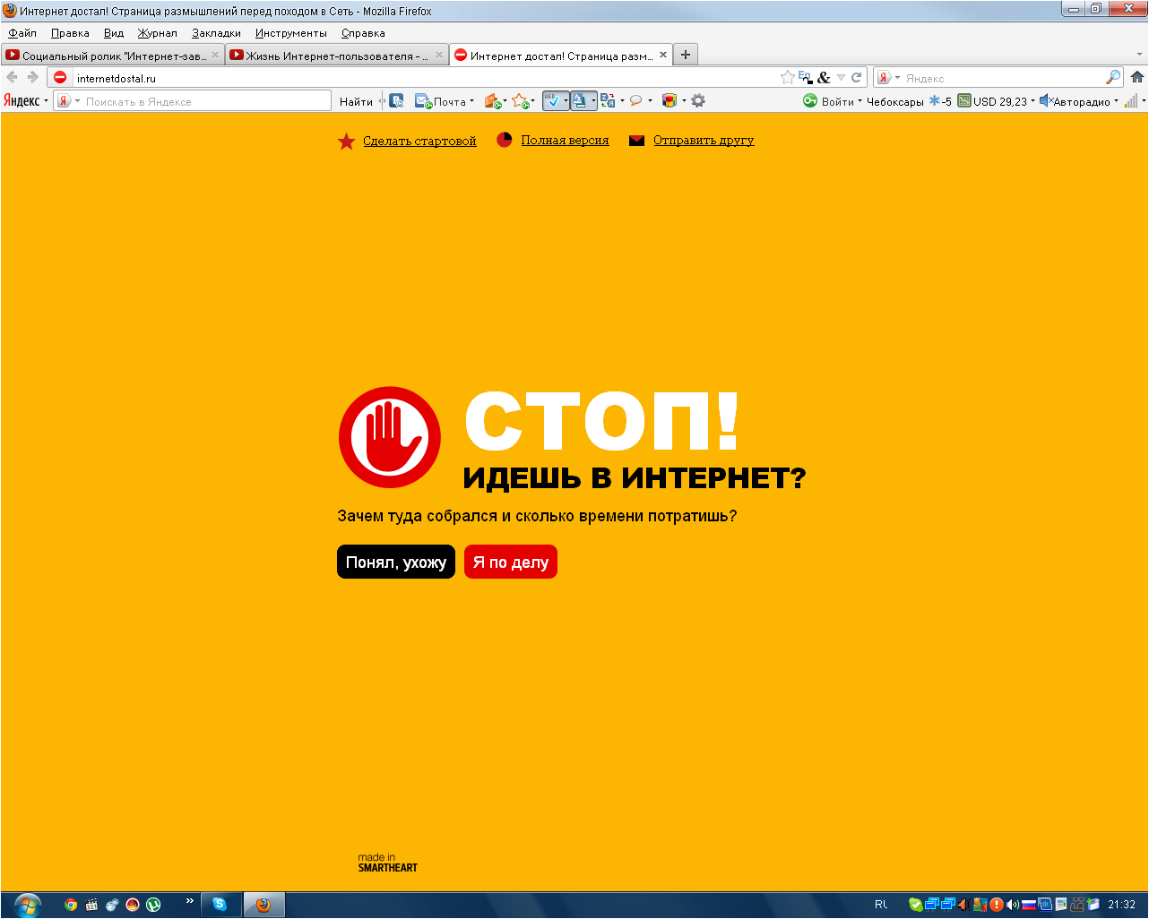Учитель: Итак, сегодня мы с вами не нашли однозначного ответа, но я надеюсь, что я помогла вам задуматься о вреде и пользе Интернета. Я хочу вам дать совет: (демонстрируется слайд на экране) Прежде чем включить интернет – задай себе вопрос: Зачем? (ссылка на сайт http://www.internetdostal.ru/)