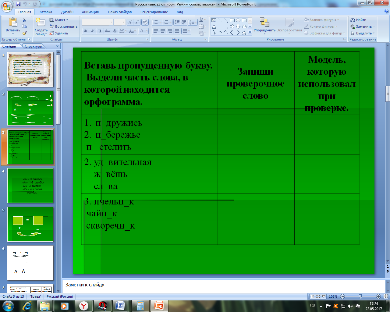 - Молодцы, с моделями вы справились А сможете ли вы их использовать при работе со словами? - Я предлагаю поработать со словами, в которых есть слабые позиции в значимых частях слова. Прочитайте задание и расскажите порядок вашей работы.