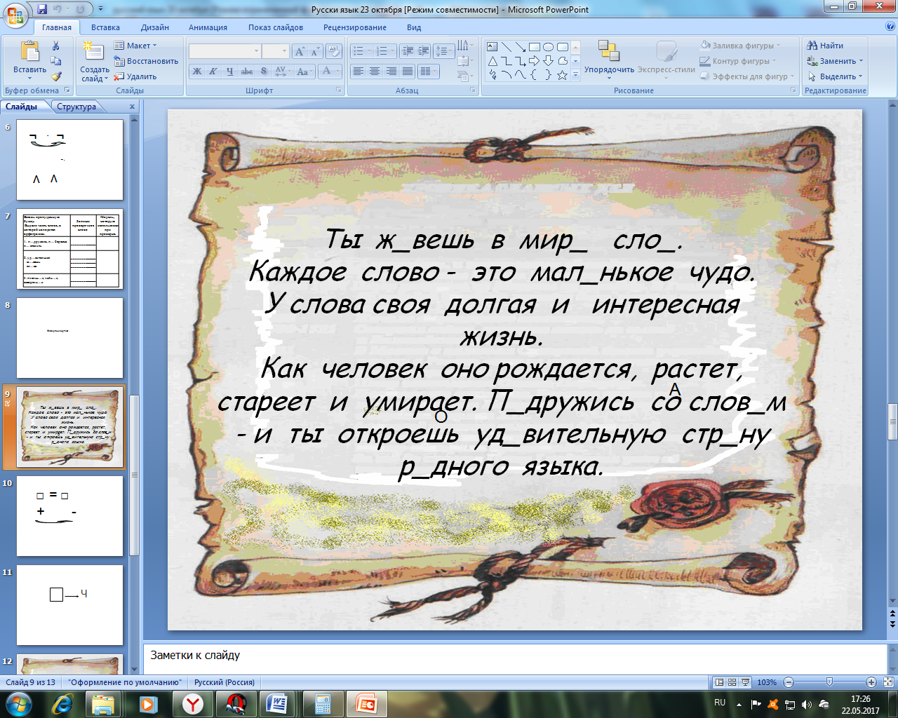 | Создание ситуации инт. разрыва - Со словами вы справились. В русском языке мы общаемся не только отдельными словами, а составляя высказывания и тексты. А в тексте вы сможете вставить орфограммы? - Прочитаем текст, в котором используются некоторые слова, с которыми вы работали. Ты ж_вешь в мир_ слов. Каждое слово - это мал_нькое чудо. У слова своя долгая и интересная жизнь. Как человек, оно рождается, растёт, стареет и умирает. П_дружись со слов_м - и ты _ткроешь удивительную страну родного языка. - О чём этот текст? - С чем сравнивается слово? - Что происходит со словом? - Как понимаете эти слова? - К чему призывает автор текста?