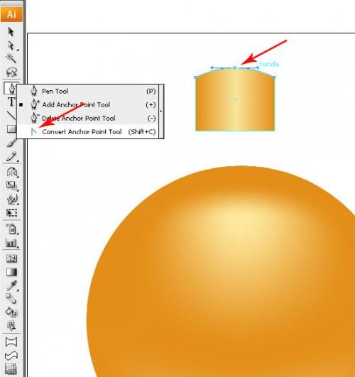 Для того, чтобы сгладить получившийся острый угол, возьмите инструмент «ConvertAnchorPointTool»(‹Shift+C›), выделите им верхнюю точку и немного потяните вправо — появившиеся направляющие создадут плавную дугу.