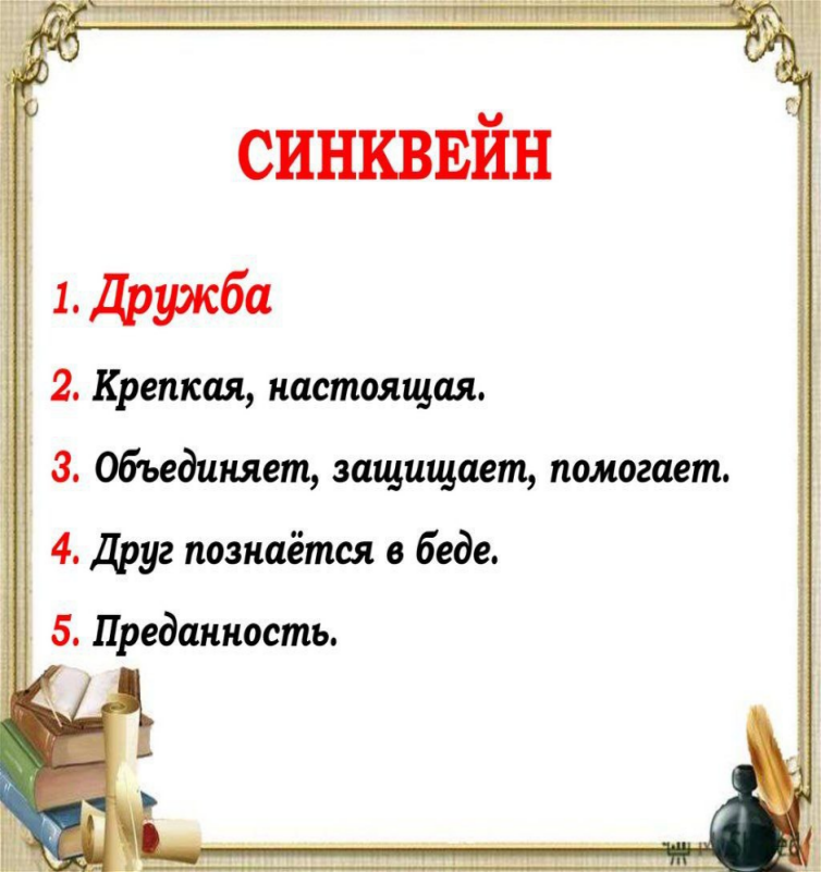Учитель: У вас на парах лежат ладошки, возьмите их и на пальчках мы сделаем с вами синквейн слова «Дружба». А вы мне в этом поможете. Вспоминаем алгоритм заполнения Синквейна.