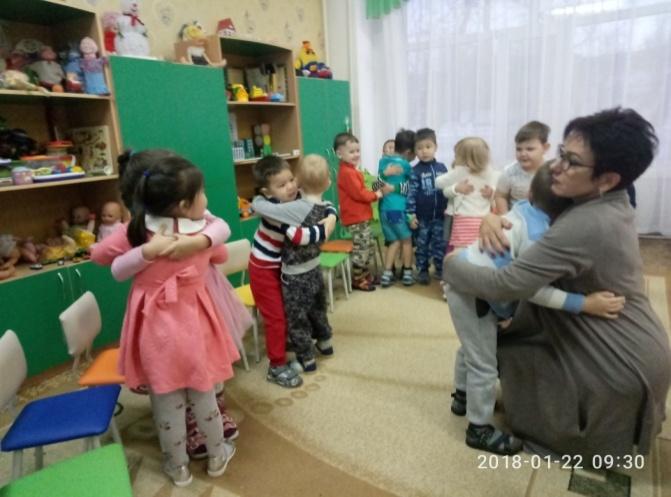 Благодаря объятиям вы сделаете отношения с родными людьми еще более близкими и теплыми, подарите им ощущение надежности и комфорта! Предлагает всем детям обнять друг друга.