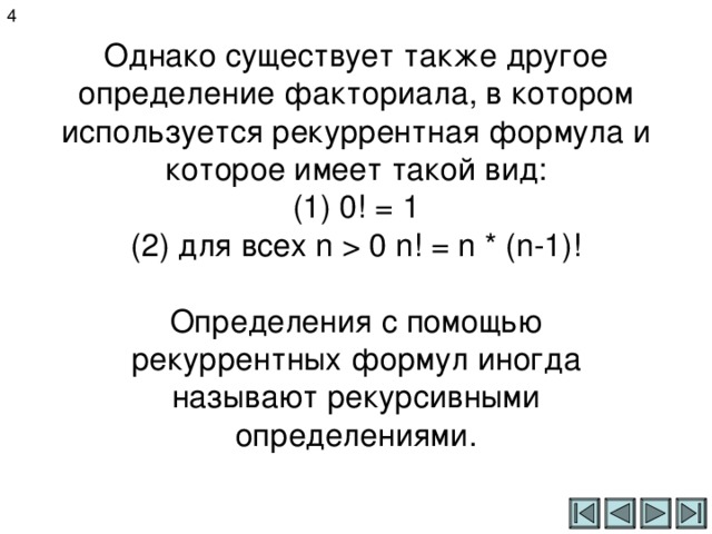 Однако существует также другое определение факториала, в котором используется рекуррентная формула и которое имеет такой вид: (1) 0! = 1 (2) для всех n 0 n! = n * (n-1)! Определения с помощью рекуррентных формул иногда называют рекурсивными определениями.