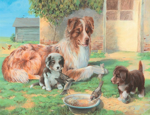 - Это собака со щенятами. Собака большая, рыжая, лохматая, добрая. У собаки двое щенят. Один сидит около мамы, другой стоит и смотрит на воробьев. Щенки маленькие, пушистые, неуклюжие. Хозяин принес собакам еду. К миске с едой прилетели воробьи. Воробьи не улетают, потому что не бояться собаки и щенков.