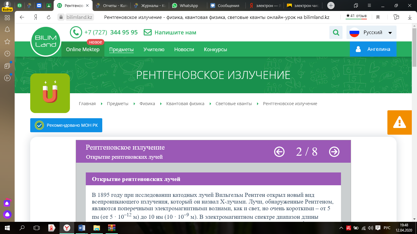 | Изучи | Здравствуй. Запиши в тетради дату и тему урока. Открой. Прочитай.Физика 9 класс, Закирова Н.А., Аширов Р.Р. стр 195-199 Посмотри видеоурок по ссылке https://bilimland.kz/ru/courses/physics-ru/kvantovaya-fizika/svetovye-kvanty/lesson/rentgenovskoe-izluchenie