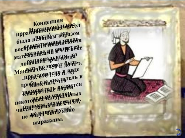 Математики Индии, Ближнего и Среднего Востока, развивая алгебру, тригонометрию и астрономию, не могли обойтись без иррациональных величин, которые, однако, длительное время не признавали за числа.