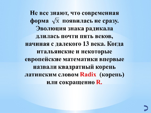Современный знак корня произошел от обозначения, примяемого немецкими математиками XV-XVI вв.: