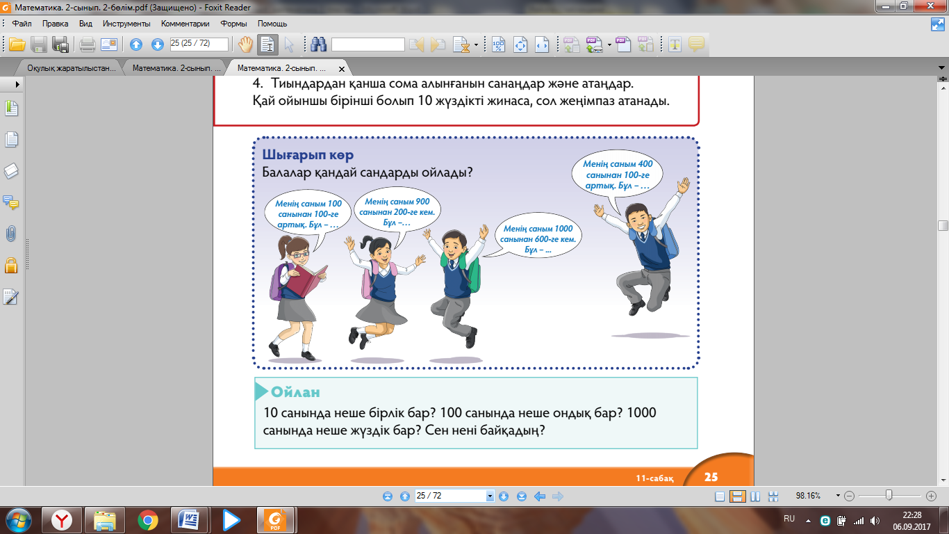 | Сабақ негізделген оқу мақсаттары | 2.1.1.4 санаудың ірі бірлігі – жүздікті құрастыру; 1000- ға дейін жүздіктермен санау, жазу, салыстыру | |||||||||