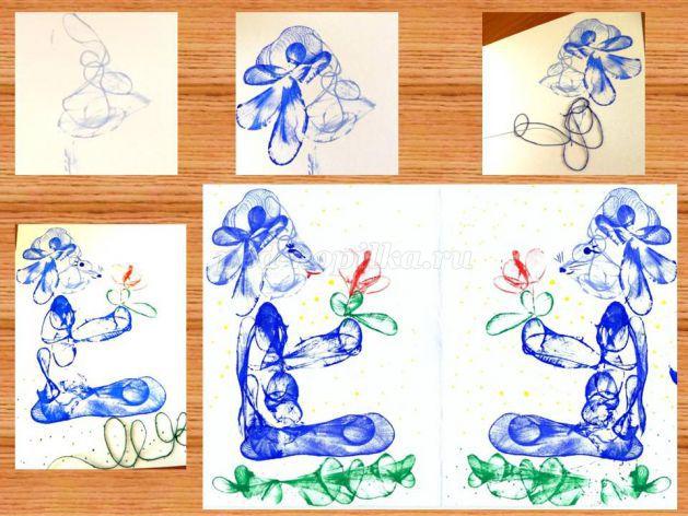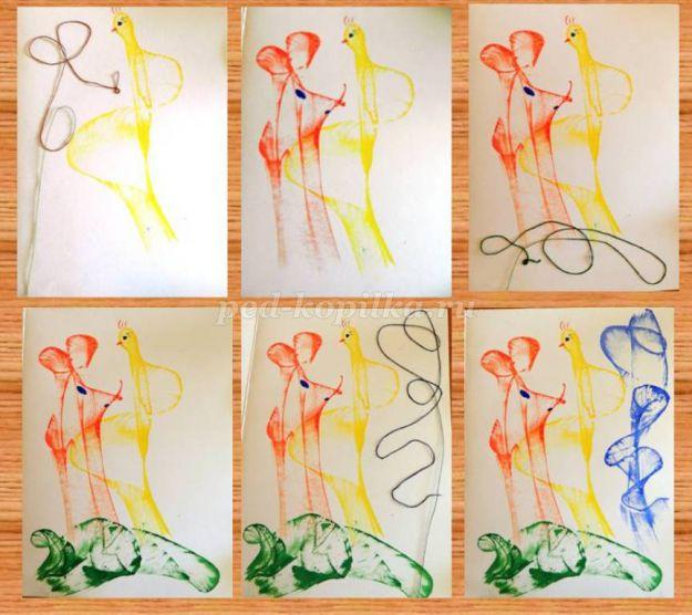 Хорошо использовать толстую шерстяную нить - ворс оставляет на бумаге самые замысловатые силуэты.