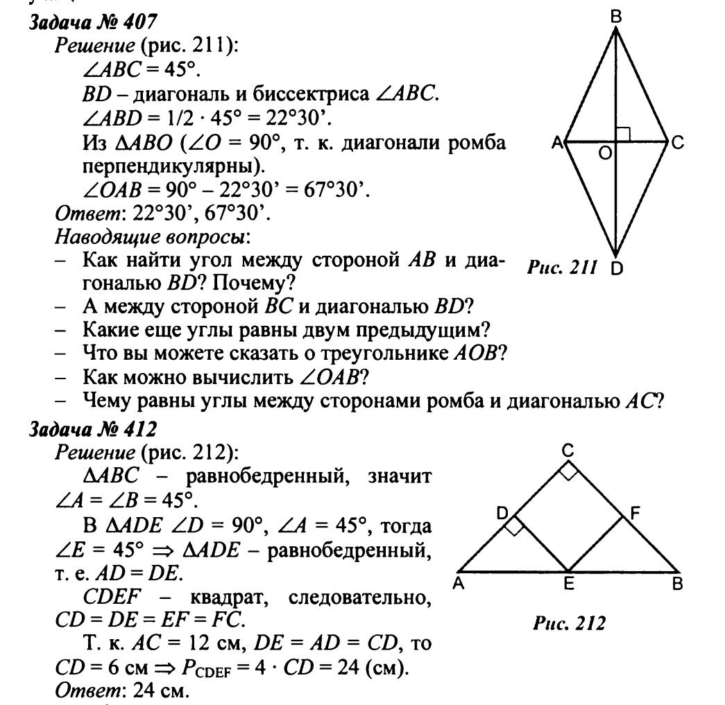 Решение: ∠B = 60°, АВ = ВС (так как АВ и ВС - стороны ромба), тогда ∠BAС = ∠BCA= 60°, то есть ∆АВС - равносторонний и АВ = АС = 10,5 см. У ромба все стороны равны, поэтому PABCD = 4 ∙ АВ = 4 ∙ 10,5 = 42 (см). Ответ: 42 см. № 407 Решение: ∠ABC = 45°. BD - диагональ и биссектриса ∠ABC. ∠ABD = 45° : 2 = 22°30' Из ∆ABO (∠O = 90°, так как диагонали ромба перпендикулярны): ∠OAB = 90° - 22°30' = 67°30' Ответ: 22°30’, 67°30'