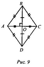 Доказательство: 1. АВС – равнобедренный (по признаку равнобедренного треугольника), т.к. ВО –высота и медиана АВС, ( ВО=ОD (по св-ву диагоналей параллелограмма)) т.е. АСВD. Следовательно, АВ=ВС (по следствию из определения равнобедренного треугольника).