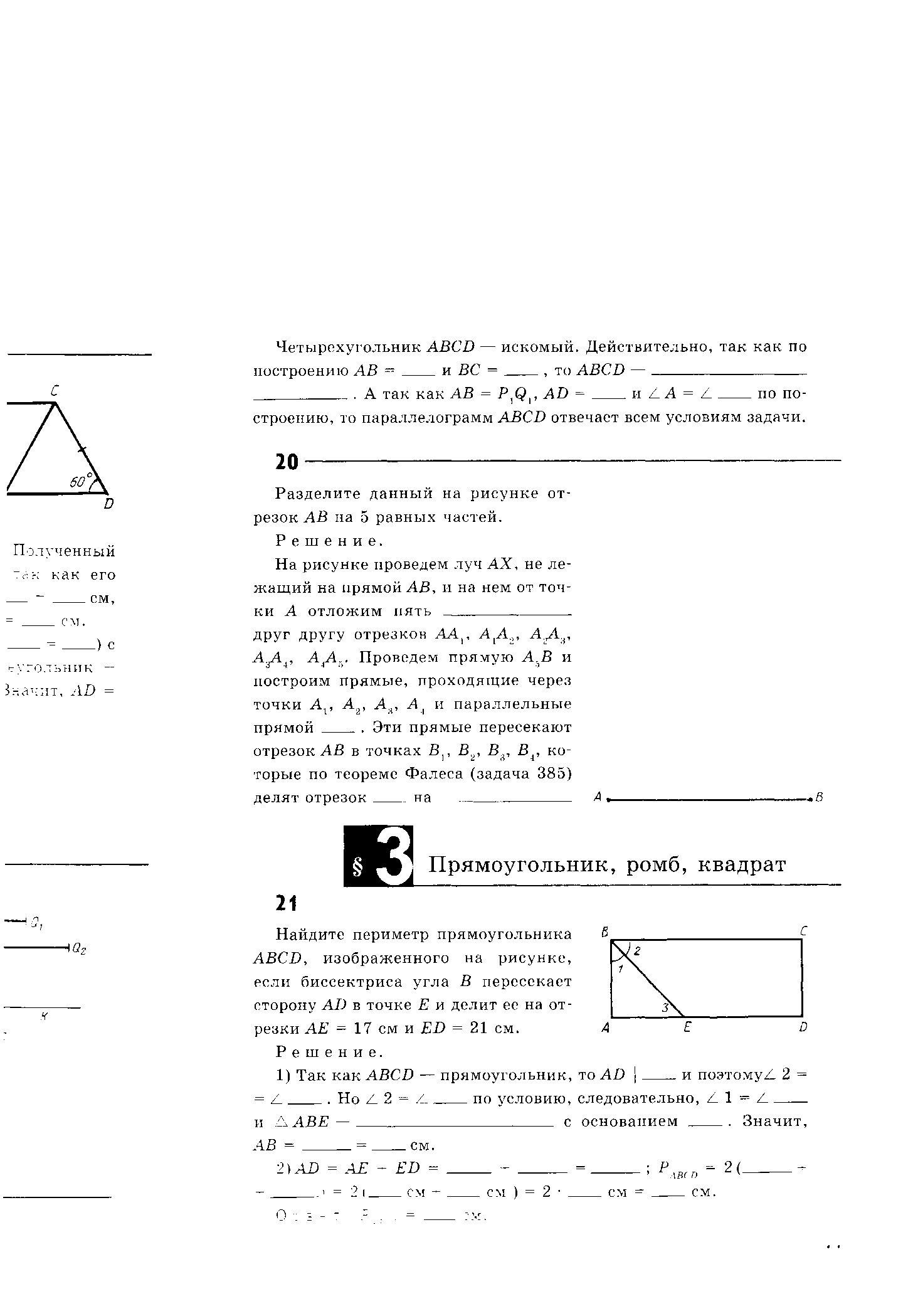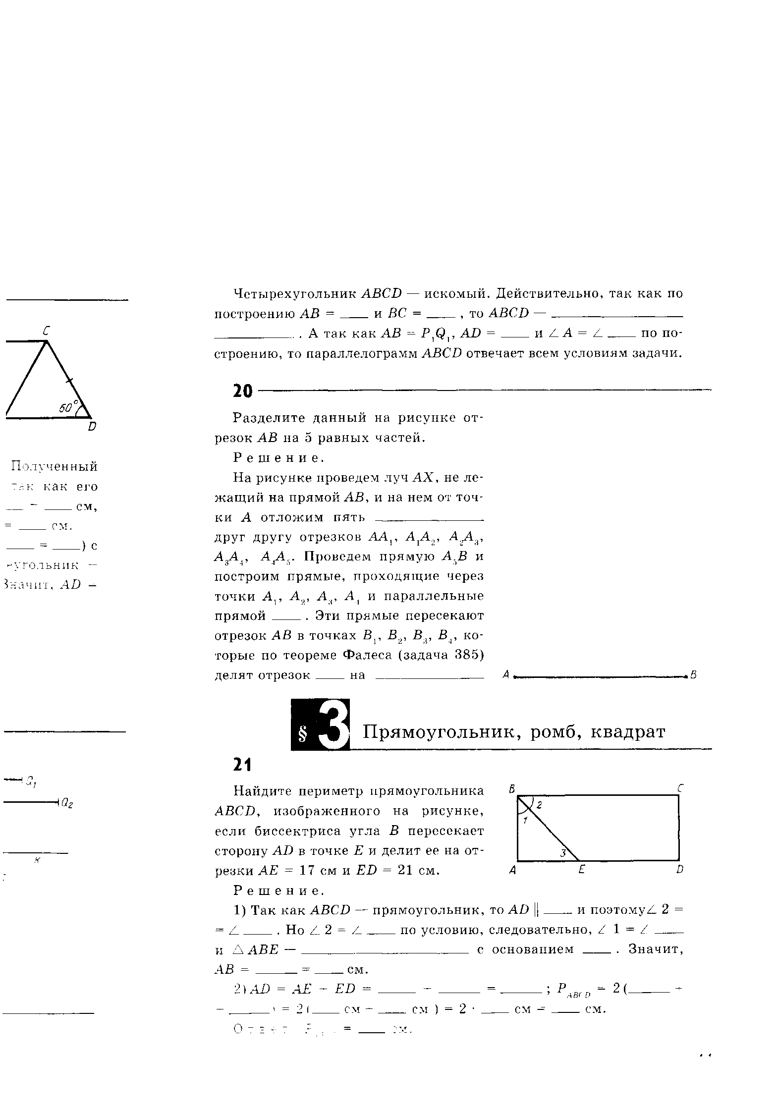 | К Найдите периметр прямоугольника ABCD, изображённого на рисунке, если биссектриса угла В пересекает сторону AD в точке Е и делит её на отрезки АЕ = 17 см и ЕD = 21 см.