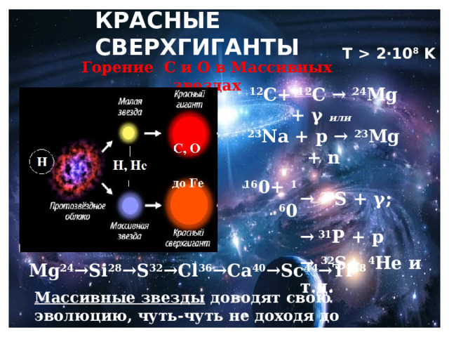 2·10 8 K Горение С и О в Массивных звездах 12 С+ 12 С → 24 Mg + γ или 23 Na + p → 23 Mg + n 16 0+ 16 0 → 32 S + γ; → 31 P + p → 32 S+ 4 He и т.д. Mg 24 →Si 28 →S 32 →Cl 36 →Ca 40 →Sc 44 →Ti 48 Массивные звезды доводят свою эволюцию, чуть-чуть не доходя до железа, потом взрываются " width="640"