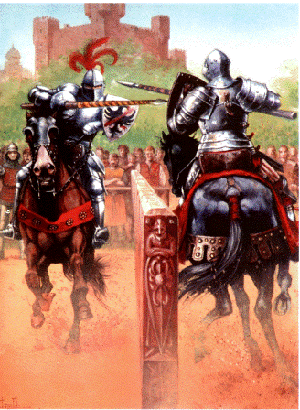 (На турнире два рыцаря скакали навстречу друг другу верхом на конях и, нанося удары длинными копьями, старались выбить противника из седла).