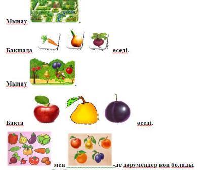 Жұптық жұмыс: Берілген сөздерді дұрыс сәйкестендіріп жаз. бауырсақ қызыл мәнті ішемін асхана көкөністер тамақ үлкен бақ дәмді бақша жемістер алма жеймін Өзіндік жұмыс: (кейбірі орындайды) Өзіне ұнаған жемістер мен көкөністер туралы қысқаша әңгімелеп береді.