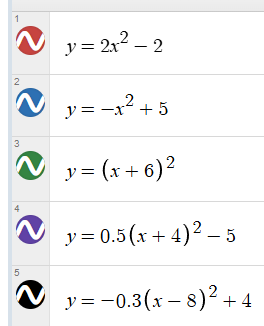 а) у=х2-4; б) у=(х+3)2; в) у=-х2+1; г) у=-(х+4)2-2; д) у=(х-3)2+3.