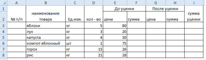 Задание: Создать таблицу в Excel. Посчитать сумму до и после уценки товара, если уценка товара составит 8 %. Посчитать сумму уценки. Посчитать сумму уценки за весь товар (создать дополнительную строку для расчёта)