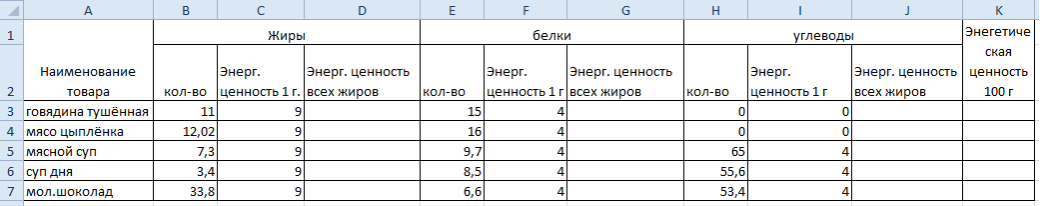 Создать талицу в Excel. Определите энергетическую ценность товара в 100 г.