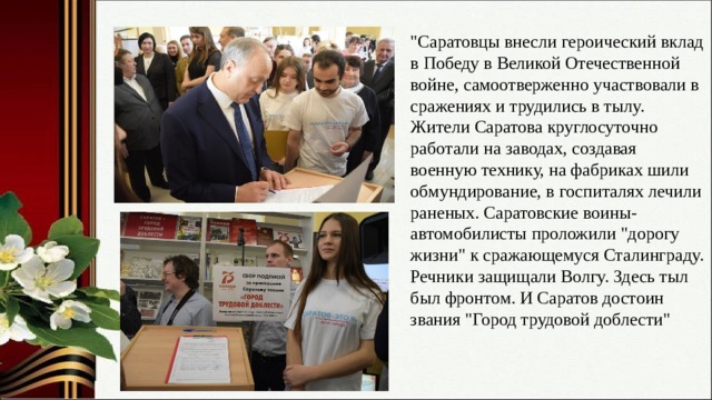 "Саратовцы внесли героический вклад в Победу в Великой Отечественной войне, самоотверженно участвовали в сражениях и трудились в тылу. Жители Саратова круглосуточно работали на заводах, создавая военную технику, на фабриках шили обмундирование, в госпиталях лечили раненых. Саратовские воины-автомобилисты проложили "дорогу жизни" к сражающемуся Сталинграду. Речники защищали Волгу. Здесь тыл был фронтом. И Саратов достоин звания "Город трудовой доблести"