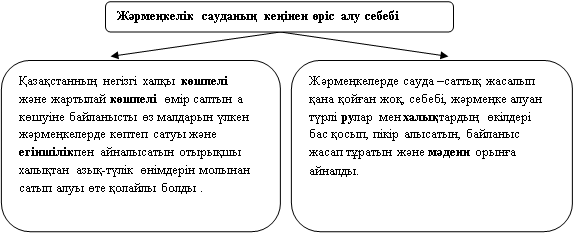 Қазақстанның негізгі халқы көшпелі және жартылай көшпелі өмір салтын а көшуіне байланысты өз малдарын үлкен жәрмеңкелерде көптеп сатуы және егіншілікпен айналысатын отырықшы халықтан азық-түлік өнімдерін молынан сатып алуы өте қолайлы болды .