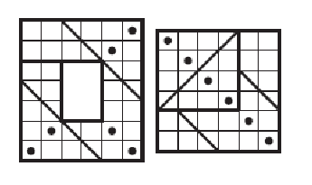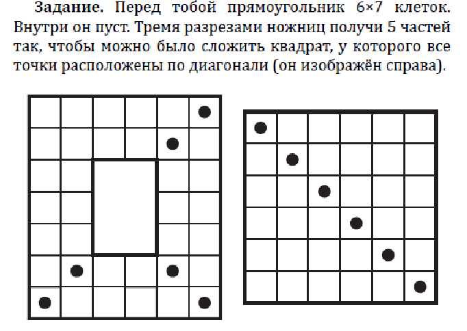 Дан прямоугольник 6* 7 клеток. Внутри он пуст. Тремя разрезами ножниц необходимо получить 5 частей так, чтобы можно было сложить квадрат, у которого все точки расположены по диагонали (он изображен справа)