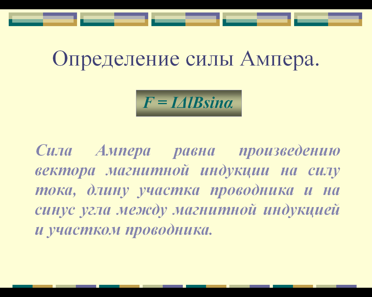 Определение (слайд № 4): Сила Ампера равна произведению вектора магнитной индукции на силу тока, длину участка проводника и на синус угла между магнитной индукцией и участком проводника.