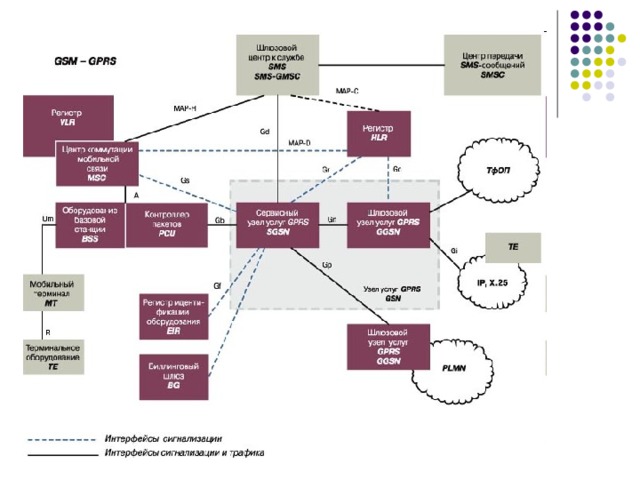 - Система GPRS надстраивается над существующей сетью GSM, в которую необходимо добавить два базовых узла: сервисный узел пакетной передачи GPRS (Serving GPRS Support Node - SGSN) и шлюзовой узел услуг GPRS (Gateway GPRS Support Node - GGSN)