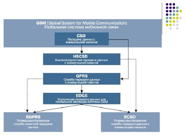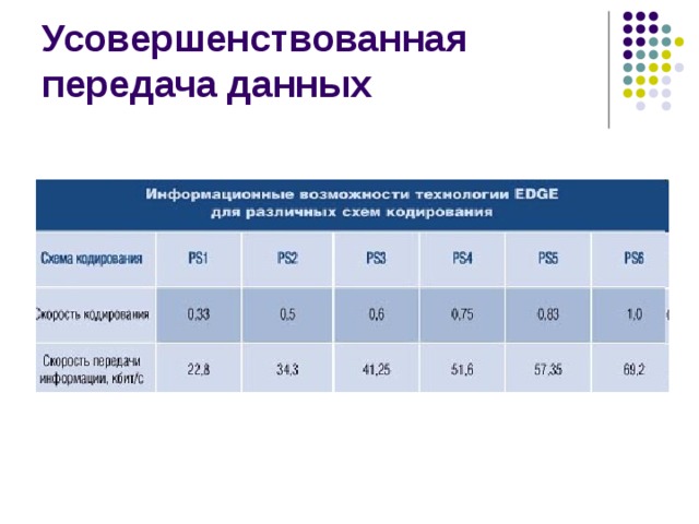 - По сравнению с базовым GSM максимальная скорость передачи на один физический канал увеличивается до 38,4 кбит/с для ECSD и до 69,2 кбит/с для EGPRS