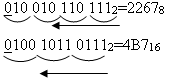 3. Чтобы перевести число из двоичной системы в восьмеричную (шестнадцатеричную), его нужно разбить на триады (тетрады), начиная с младшего разряда (справа налево), в случае необходимости дополнив старшую триаду (тетраду) нулями, и каждую триаду (тетраду) заменить соответствующей восьмеричной (шестнадцатеричной) цифрой (табл.).