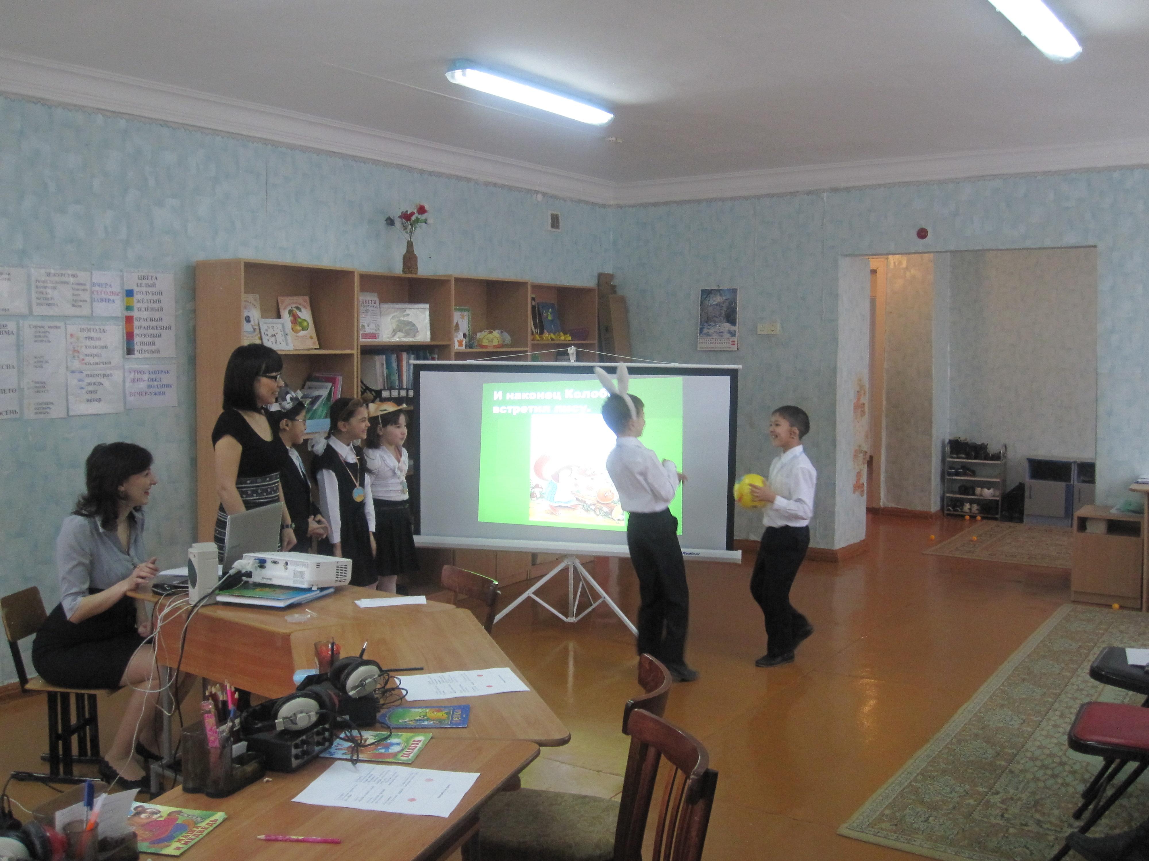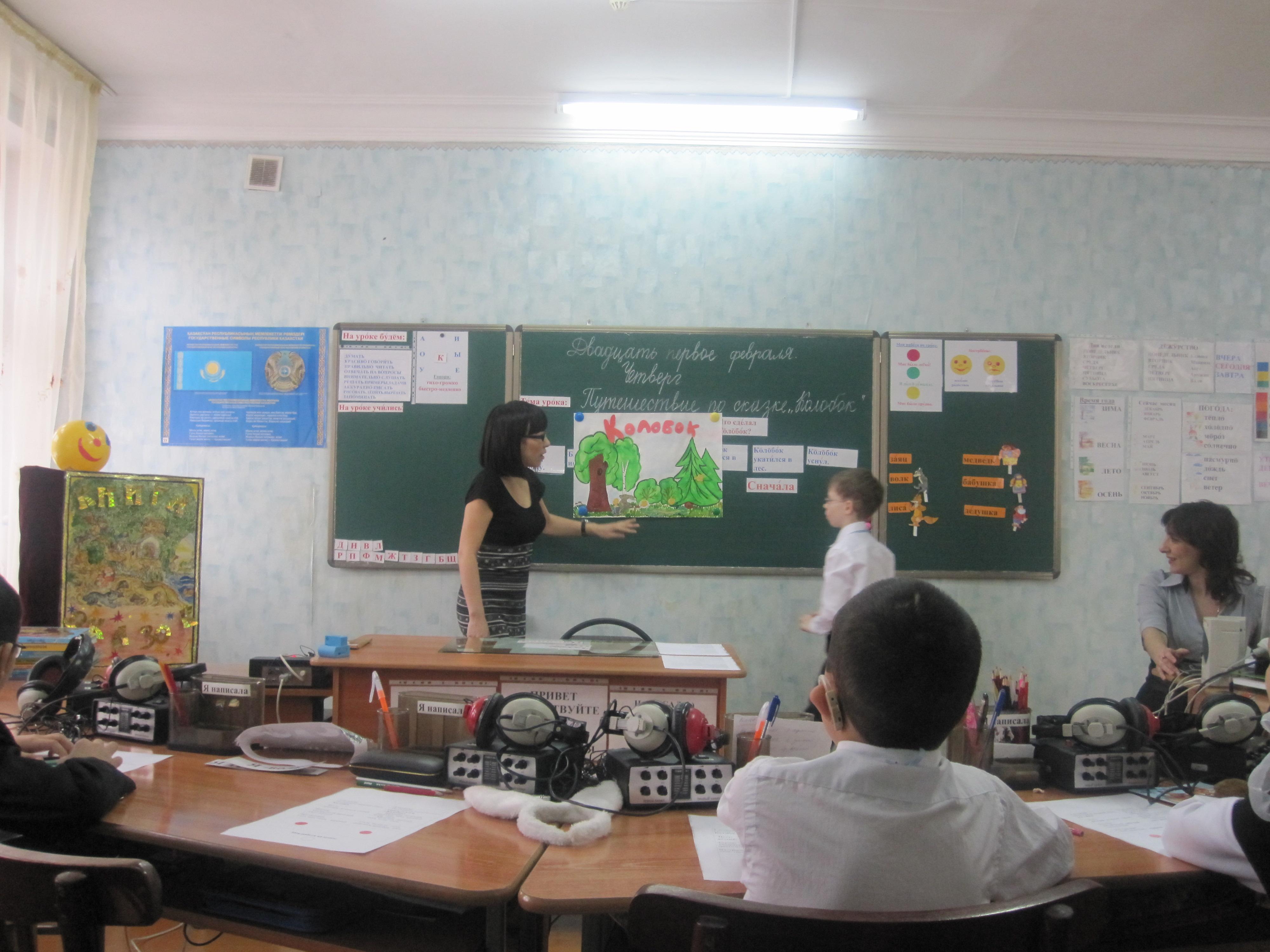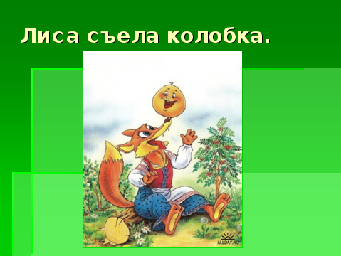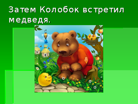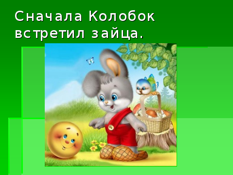 | Этапы урока. Деятельность учителя. 1. Мотивационно-целевой этап. Организационный момент Встаньте красиво. Поздоровайтесь. Настроение у всех доброжелательное, радостное. Сядьте. У нас сегодня на уроке гости. Гости будут смотреть как вы умеете правильно говорить, думать, писать. Ксюша,Какой сейчас урок? Что будем делать, Валя? Давайте вместе красиво скажем: Итак, будем: правильно, красиво говорить внимательно слушать Асет,какое сегодня число и месяц? Какой сегодня день недели, Максим? Фонетическая ритмика. Прочитайте: ка-ко-ку-ки ( тихо, громко, медленно, быстро) Знакомство с гостем урока. Ребята, у нас сегодня на уроке есть необычная книга-книга сказок! А какие сказки живут в этой книге, как думаете? Вкатывается колобок. Ой, кто это? ( Колобок) Правильно. Сегодня Колобок будет гостем нашего урока и узнает, кто читал сказку о нём. 2. Операционный этап. Работа по теме урока, с применением компетентностно-ориентированных заданий Посмотрите какой колобок красивый! Опишите сами Колобка. 1 здание (КОЗ) Подчеркни верный ответ: жёлтый, зелёный, синий, круглый, квадратный, треугольный, весёлый, злой, грустный). Давайте узнаем правильный ответ Зарисуйте смайлик своей отметки. А какие ещё есть герои в сказке «Колобок»? Снимите аппараты, наденьте наушники. Слушайте внимательно( работа с экраном): бабушка, медведь, волк, лиса. Что услышали? 2 задание (КОЗ) Сейчас самостоятельно подчеркните верный ответ с героями сказки «Колобок» во втором задании . Давайте узнаем правильный ответ. Зарисуйте смайлики своей отметки. 3 здание (КОЗ) А что делали герои в сказке? Что испекла бабушка? Верно. Что сделал колобок? Показ плаката «Колобок в лесу». Физминутка. Возьмите свои колобки, покатайте их на ладонях: Скок-скок-скок покатился колобок Скок-скок-скок покатился он в лесок А в лесу есть звери: волк, лиса , медведи. Скок-скок-скок убегает колобок. Покажите, как покатился наш герой. Обогащение словаря учащихся. Вспомните, какой путь был у Колобка. От кого Колобок убегал? 4 задание Сначала он встретил… Затем он встретил… Потом он встретил… И наконец он встретил… А сейчас посмотрим правильно ли мы угадали путь Колобка по лесу. Давайте проиграем с вами сказку. Инсценирование сказки. Кто будет медведем? Кто будет волком? Кто будет лисой? Кто будет Колобком? Закрепление. Покатился Колобок по лесу. Сначала встретил зайца. Заяц сказал : Колобок попросил: Заяц ответил: Покатился Колобок дальше по лесу. Встретил затем волка. Волк сказал: Колобок попросил: Волк ответил: Покатился Колобок дальше по лесу. Сначала встретил медведя. Медведь сказал Колобок попросил: Медведь ответил: Покатился Колобок дальше по лесу. Потом встретил лису. Лиса сказала : Колобок попросил: Лиса ответила: И съела колобка. Ребята , какой конец у этой сказки: грустный или весёлый? ( смайлики настроения) А вам нравится конец сказки: Лиса съела колобка?(Нет) 3.Итоговый этап. Домашнее задание. Давайте придумает весёлый конец сказки «Колобок» сами. Это будет ваше домашнее задание. А для того, чтобы выполнить домашнее задание вот вам подсказка. Оценивание. Рефлексия. Какой был урок? Что делали на уроке? Как вы сегодня работали на уроке? Колобок соглашается Закрасьте смайлики. Вы, все отлично работала на уроке и получаете все отметку «пять», а так же в подарок эти жёлтые мячики, с которыми работали на физминутке. Урок закончен. 
