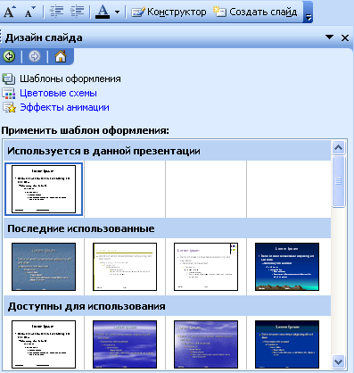 Шаблондарды пайдаланып құру әрекетін POWER POINT программасы іске қосылған мезетте ашылған сұқбат терезеде Презентациялар шаблоны (шаблон презентаций) опциясын таңдау арқылы құру мүмкіндігі бар немесе Формат – слайдты көркемдеу (Формат – Оформление слайд) командасын орындап құруға болады. Осы опция таңдалғаннан кейін Жалпы (Общие), Презентациялық дизайндары (Дизайны презентация), Презентациялар, Web- парақтар (web-страницы) астарлы беттерінен тұратын, Презентацияны құру сұхбат терезесі ашылады. Осы сұхбат терезе Файл- Құру командасын орындағаннан кейін де ашылады. Презентацияның шаблоның тышқан көмегімен белгіліген кезде шығатын үлгіден қарап отырып, өзімізге ұнағанын таңдап ОК батырмасын шертеміз. Осы мезетте экранға Слайд құру сұхбат терезесі шығады. Бұл сұхбат терезеде қажетті слайдтың түрін көрсетуіміз қажет. Экранда таңдалған шаблонға сәйкес бос презентация пайда болады. Осы презентацияға тиісті мәтіндерді енгізіп, арнайы эффектілер қосып, көрекмдейміз.