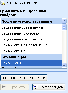 Слайд элементтеріне анимациялық эффектілер қосу үшін, Слайдты көрсету – Анимация қосу (Показ слайда – ностройка анимации) командасын орындаймыз. Осы кезде Анимация қосу (Настройка анимации) сұқбат терезесі ашылады. Эффектілер ішкі бетінде Анимациялар реті (Порядок анимации) өрісінде қажетті элементті белгілеп, эффектіні және элементтерінің пайда болуын және анимациядан кейінгі түсі мен эффектісін таңдай аламыз.