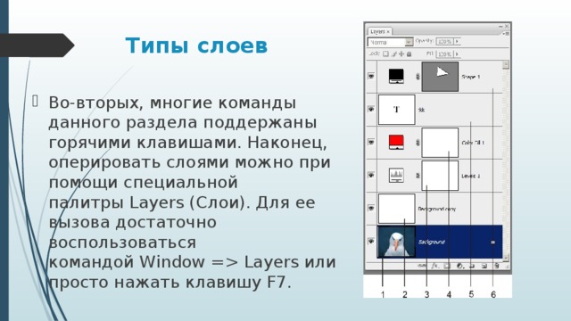 - Во-вторых, многие команды данного раздела поддержаны горячими клавишами. Наконец, оперировать слоями можно при помощи специальной палитры Layers (Слои). Для ее вызова достаточно воспользоваться командой Window = Layers или просто нажать клавишу F7.