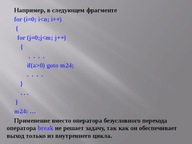 0) goto m 24; . . . . } . . . } m 24: … Применение вместо оператора безусловного перехода оператора break не решает задачу, так как он обеспечивает выход только из внутреннего цикла. " width="640"