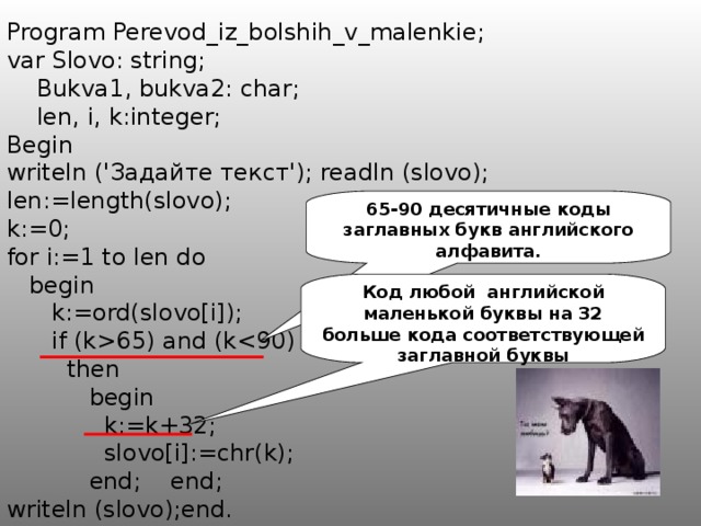 65) and (k then begin k:=k+32; slovo[i]:=chr(k); end; end; writeln (slovo);end. 65-90 десятичные коды заглавных букв английского алфавита. Код любой английской маленькой буквы на 32 больше кода соответствующей заглавной буквы " width="640"