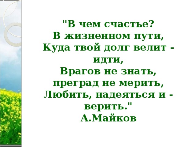 "В чем счастье? В жизненном пути, Куда твой долг велит - идти, Врагов не знать, преград не мерить, Любить, надеяться и - верить." А.Майков
