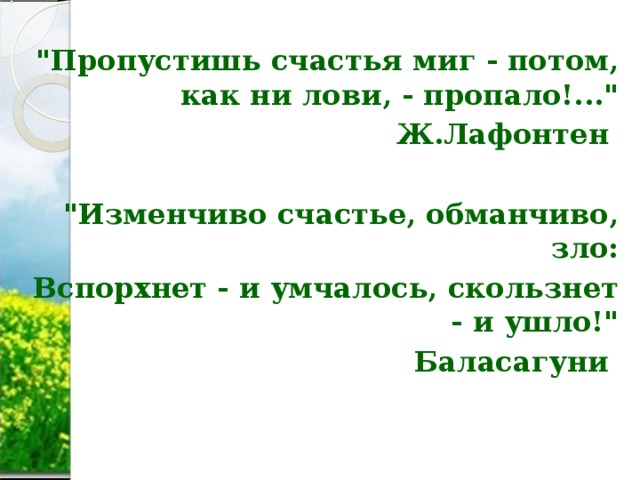 "Пропустишь счастья миг - потом, как ни лови, - пропало!..."