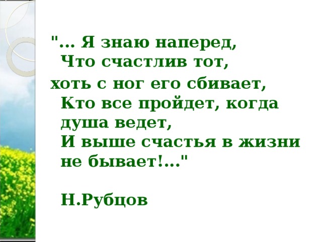 хоть с ног его сбивает, Кто все пройдет, когда душа ведет, И выше счастья в жизни не бывает!..." Н.Рубцов