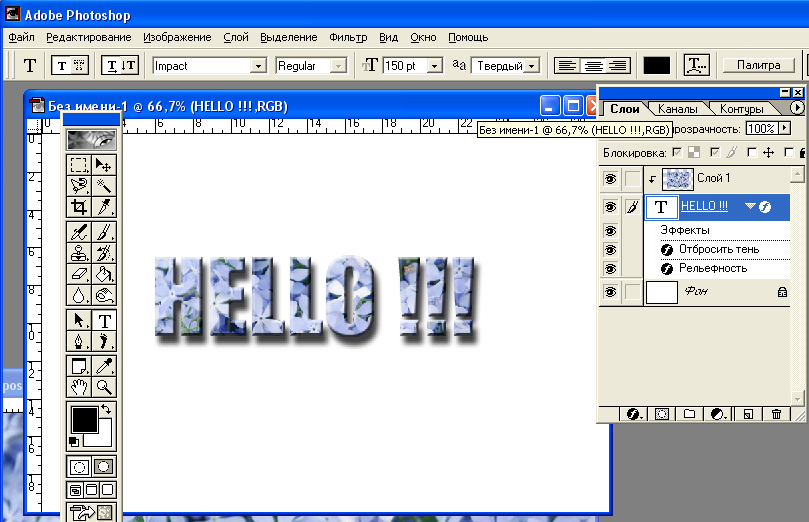 7. Вернитесь на второй слой с надписью и с помощью Слой – Эффекты слоя придайте надписи Тень и Рельеф.