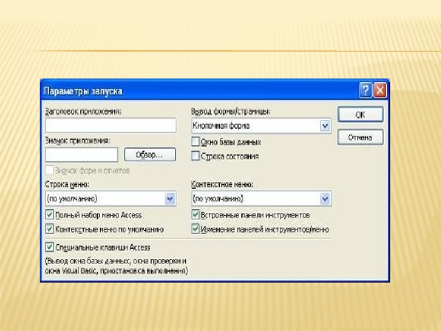 - Для того чтобы эта форма отображалась при запуске базы данных, необходимо выполнить команду Сервис/Программы запуска, и в открывшемся окне выбрать "Кнопочная форма" из раскрывающегося списка, кроме того, надо снять флажки Окно базы данных и Строка состояния. Можно также ввести заголовок и значок приложения.