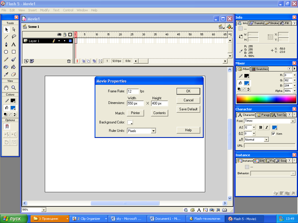 Можно создать файл анимации (AVI-файл), используя популярную программу Macromedia Flash. В Macromedia Flash анимация, которую так же довольно часто называют роликом (Movie), состоит из слоев. В простейшем случае ролик представляет собой один единственный слой (Layer). Слой — это последовательность кадров (Frame), которые в процессе воспроизведения анимации выводятся и последовательно, один за другим. Если ролик состоит из нескольких слоев, кадры анимации получаются путем наложения кадров одного слоя на кадр другого. Например, один слой может содержать изображение фона, на котором разворачивается действие, а другой — изображение персонажей. Возможность формирования изображения путем наложения слоев существенно облегчает процесс создания анимации. Таким образом, чтобы создать анимацию, нужно распределить изображение по слоям и для каждого слоя создать кадры.