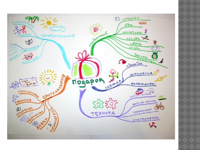 - Центральная картинка (идея, задача) должна быть больше остальных и располагаться по центру.